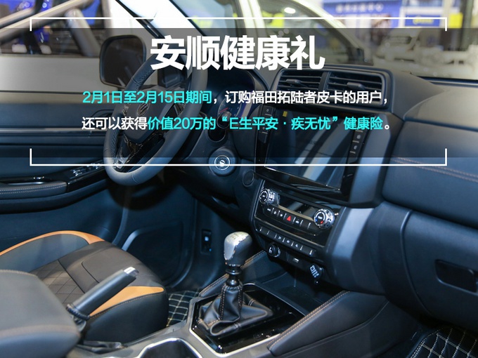 2月1日至2月15日期间,订购福田拓陆者皮卡的用户,还可以获得价值20万的“E生平安·疾无忧”健康险。