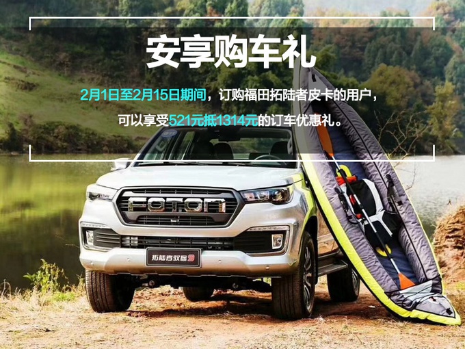 2月1日至2月15日期间,订购福田拓陆者皮卡的用户,可以享受521元抵1314元的订车优惠礼,订购的车辆交车时间截止至3月31日。