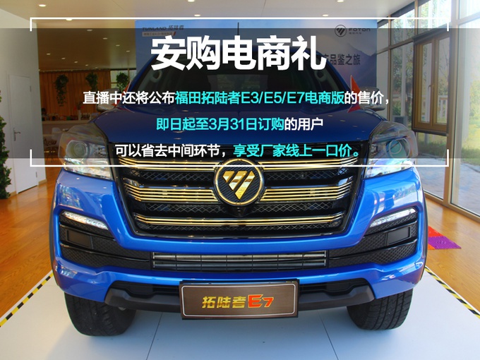 直播中还将公布福田拓陆者E3/E5/E7电商版的售价,即日起至3月31日订购的用户可以省去中间环节,享受厂家线上一口价。