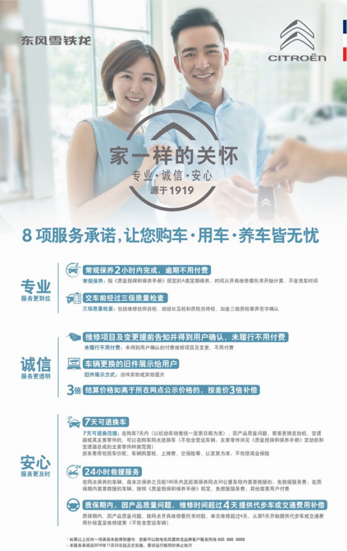 从2017年就已经启动了经销商店面升级换新的工作,目前新品牌形象店数量在80家左右,共覆盖60个城市。2019年东风雪铁龙又推出了全新升级的“家一样的关怀2.0”品牌服务承诺,围绕“专业、诚信、安心”三大服务优势,提出了8项无忧承诺。