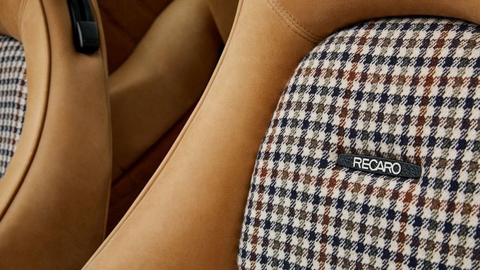 大多数定制都是针对内饰的,仪表面板、方向盘和车门面板上饰进行了皮革包覆,而翻毛皮材质则用于车顶内衬,天窗和行李箱。Recaro座椅的椅背为Loro Piana千鸟格羊毛,同时在车头行李箱内也有千鸟格装饰元素。