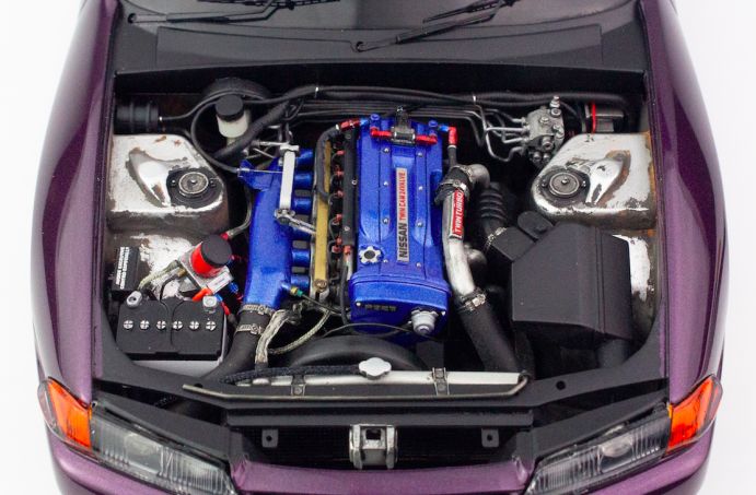 经典的纵置RB26发动机被喷成了电光蓝色,两端的避震器塔顶也进行了做旧处理,上面的油泥清晰可见,这些小细节可是十分考验玩家的耐心和创作力的。