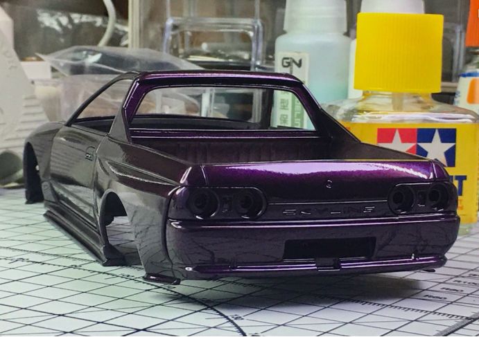 艾美紫是GTR里相当经典的颜色,在R34车型上比较常见。当这层车漆喷好之后,还要进行最后一步喷涂,就是给它紫色的外衣再罩上一层光油。喷光油的目的就是让车模漆面更亮,如果你省了这道工序,那就变成了“哑光艾美紫”了。