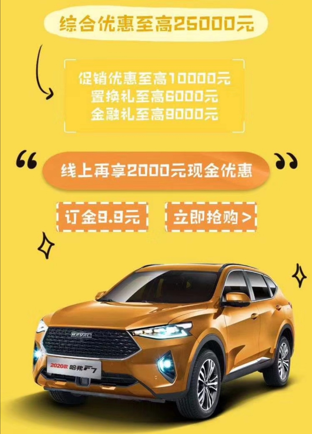 其中,长城汽车旗下哈弗品牌线上看车抢购能获得:订金最低至9.9,最高2000元的现金优惠。