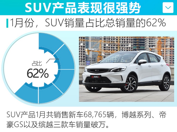 受疫情的波及导致整体购买力下降,以及购车时间大幅缩短(春节假期),各个板块均出现了不同幅度的下滑。具体车型部分,SUV产品1月共销售新车68,765辆,占比总销量的62%。其中最畅销的就是博越PRO与2020款博越组成的双车组合,在10-15万SUV市场持续攻城略地,贡献了23,472辆的销量,基本要赶上“国民神车”哈弗H6(26,414辆)的表现。
