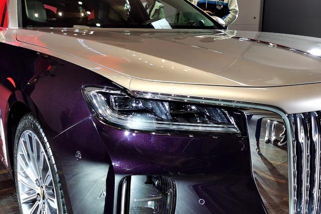 前脸醒目的红旗标识线搭配大尺寸的直瀑式进气格栅,其中前进气格栅采用"高山飞瀑、中流砥柱"的设计理念,显得庄重气势,U型镀铬装饰与矩阵式LED头灯相融,当大灯点亮时,镀铬装饰上的光带也会点亮,并带有动态效果,咖哥觉得仪式感和辨识度都是比较强的。