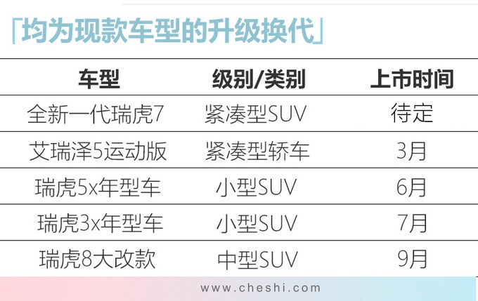 2019年以来,奇瑞在新产品投放方面一直保持较高的要求,各系列产品也是多点开花。除全新一代瑞虎8、艾瑞泽系列的升级换代外,像瑞虎5x这样的产品也进行了升级优化,为其销量的增长做出了不小的贡献。今年奇瑞还将继续加大产品投放力度,陆续推出艾瑞泽5 (配置|询价)运动版、瑞虎5x年型车、瑞虎8大改款(代号T1D)、瑞虎3x年款型。其中瑞虎8的大改款车型备受关注,今年将率先推出搭载1.5T+48V轻混系统的燃油版车型。