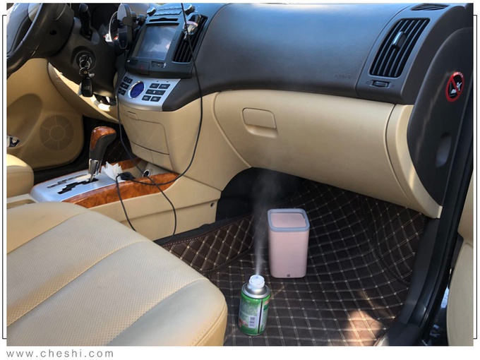 按照瓶体表明的使用步骤,首先将气雾罐水平防止在副驾驶位置,将空调开启到最大并调节内循环模式。用力按下按钮开始喷射后关好车门静待2分钟左右罐内气体释放完全。