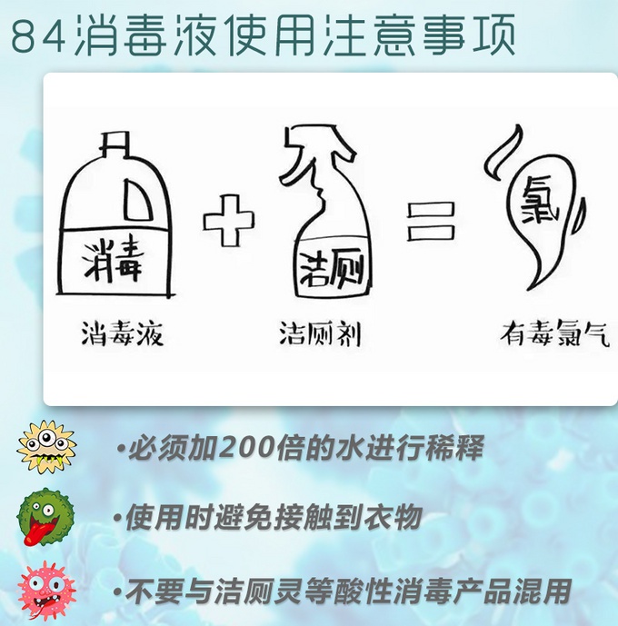 另外大家还要注意,在家用84消毒液进行除菌消毒时,84消毒液不要与洁厕灵等酸性消毒产品混用,含氯消毒剂中的氯碰到洁厕灵里的酸性成分,就很容易释放大量氯气,可能直接导致对人体呼吸道的伤害。