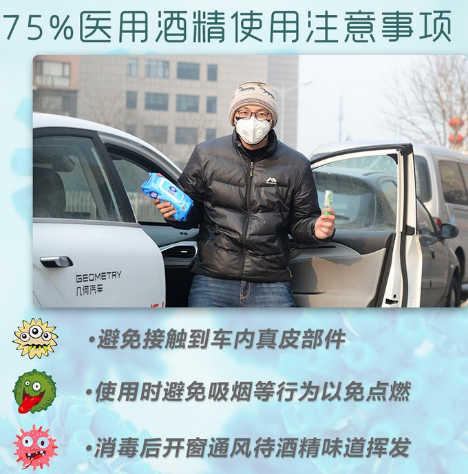 此外在进行酒精拭擦车内部件时,记得不要吸烟进行操作,车内也不要摆放打火机这类物件,否则可能引发火灾。而在酒精消毒完成后,需要打开车窗通风约十五分钟,等待酒精味道充分挥发后再将车窗关闭。