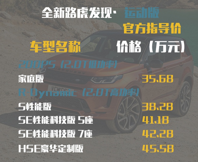 目前上市的全新路虎发现运动版定位于豪华品牌中型SUV,共分为一个动力总成两个不同的动力水准和共五款高低不同的配置。最高价的两款车型为七座版本的布局,其余车型均为五座版本。35.68-45.58万元的官方指导价较之前的高配车型已经有了一定程度的下降,同时考虑到未来捷豹路虎车型可观的终端市场优惠,与更低的顶配起售价配合,喜欢此款车型的消费者其实可以等一等再入手。