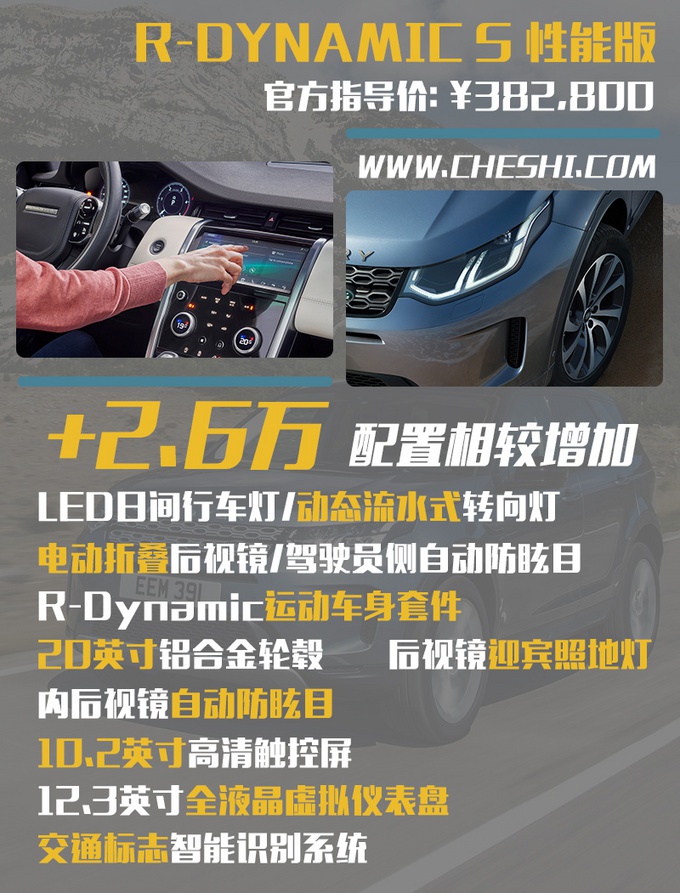 增加2.6万元的R-DYNAMIC S性能版的性价比同样不错,首先就得到了更高输出的发动机动力调校,其次R-DYNAMIC的外观风格套件在各方面颜值上也是值回票价。最重要的是内饰的双屏互联系统是此次发现运动重点升级的地方,12.3英寸的全液晶虚拟仪表盘和10.2英寸的高清触控中控屏幕在此个配置等级上进行了标配,对于手头依然不宽裕的消费者来说它是比高配车型更好的选择。