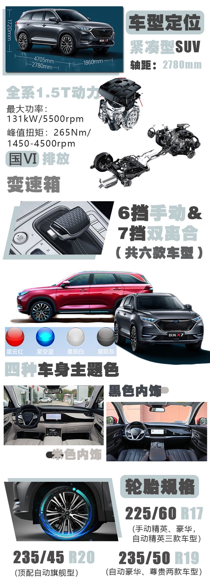 在分析具体车型之前,先给您介绍一下整个车系一些比较普遍的基础性配置。欧尚X7供、提供四种不同的车身配色可供选择,入门车型为17寸轮圈,顶配车型可以提供20寸轮圈。动力方面,全系标配我们都很熟悉的长安1.5T发动机,自动挡车型匹配7速双离合变速箱,前后独悬为全系标配。欧尚X7全系标配LED远近光,另外主副驾安全气囊、胎压监测、博世集成式电子稳定系统、上坡辅助、电子驻车等辅助安全配置全系都有搭载,配置方面诚意很足。聊完了基本参数,下面来分析下各个车型之间的差别,看看这6款车型哪款更适合您。