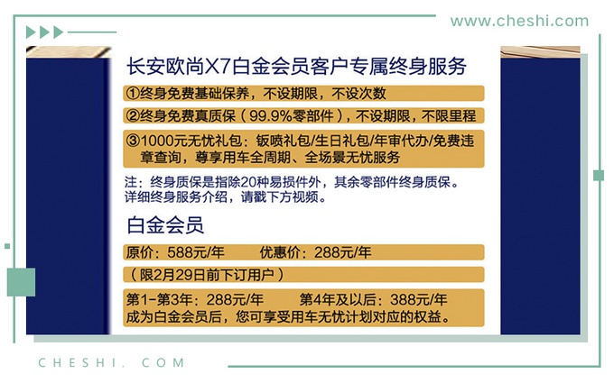 欧尚X7目前还有非常实在的购车用车政策,订购欧尚X7且成为白金会员后(抢购或者付费,价格如上图)可以享受会员专属的终身服务(1、终身免费保养,不限期限、不限次数;2、终身免费真质保(99.9%)零部件,不限期限,不限里程;3、一千元无忧礼包)。当下无论是合资还是自主品牌,推出各种金融服务政策吸引消费者无可厚非,不过车辆的质保期限一般都是3年或10万公里,最多的也就是5年或15万公里,而长安欧尚X7所推出的终身保养、维修免费的政策确实是非常实在,并且此两大政策均为全国联保,但仅首次购车用户可以享受,感兴趣的朋友可以上官网或向当地经销商了解详情。(2020年2月1日至2月29日下订长安欧尚X7可抽取"欧尚STYLE白金会员",100%的中奖率)