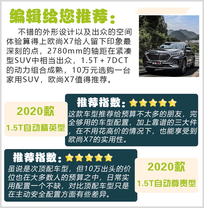 大多数消费者买SUV其实关注点都在空间上,目前市场上的众多SUV品牌也都把空间优势作为主打,玩文字游戏,小型向紧凑靠,紧凑向中型靠。而车长超过四米七,轴距接近两米八的欧尚X7算得上“大”紧凑型SUV,其乘驾空间十分有竞争力,日常工作家用完全可以满足。最后,1.5T自动精英型推荐给预算并不太多的消费者,在不花高价的情况下也能享受欧尚X7的实用性;如果对配置有要求,那这台1.5T自动尊贵型则是最合适且有性价比的选择。