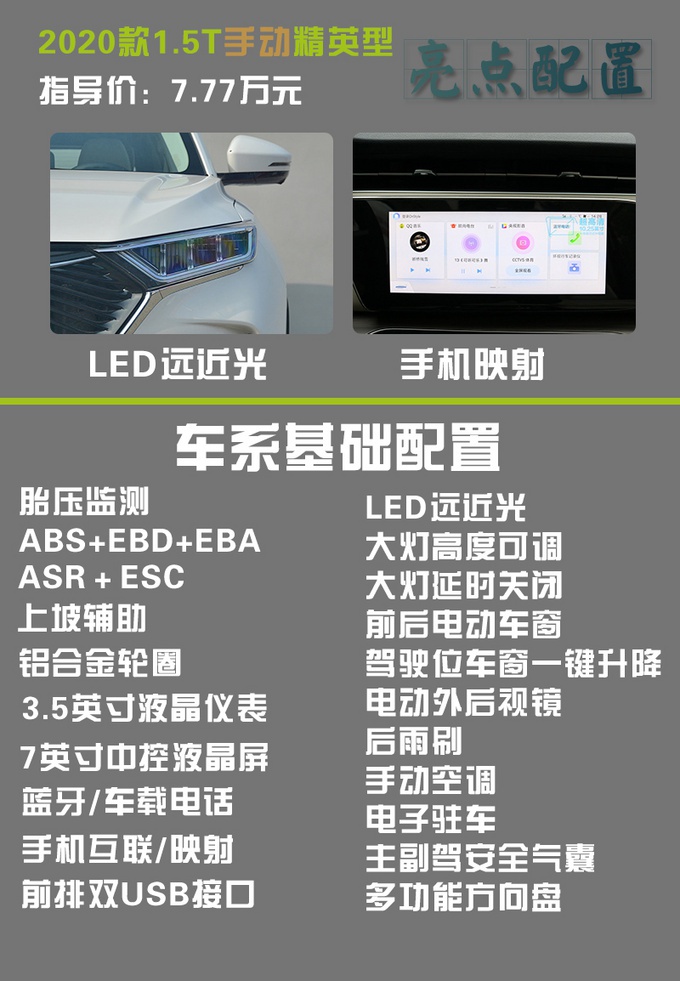 欧尚X7的入门款为指导价7.77万的手动精英型,虽说价格入门,但配置并没有太低,LED远近光、电子驻车、手机映射等日常常用配置都有搭载,动力配置方面的1.5T发动机也是满血版,并匹配6挡手动变速箱,可能不太满意的点就是塑料方向盘以及织物座椅,有些显廉价,不过考虑到其不到8万元的售价也情有可原,对于这台入门车型,如果不是预算有限,可以考虑配置更高一点的车型。