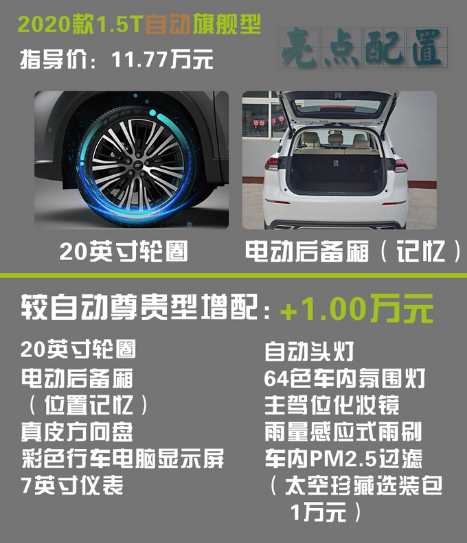 顶配版车型,该有的配置几乎都有了,对比起次顶配车型主要是完善了整车的便利性配置,如带记忆功能的电动尾门。升级的20英寸轮圈,真皮方向盘、6色氛围灯等能在一定程度上提升整车品质感。此外,欧尚X7针对顶配的自动旗舰型还提供太空珍藏选装包,售价为一万元,主要有一套APA5.0的自动泊车辅助系统、前后各6个雷达、支持人脸识别/启动、疲劳监测、全液晶继承内置摄像头仪表盘、电子换挡和手机智能蓝牙钥匙等,选装上以后的配置水平直逼20万以上的车型。