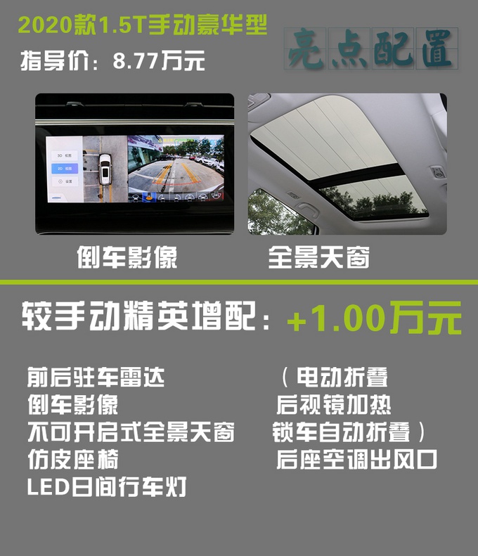 再增加一万元,可以升级天窗、倒车影像、仿皮座椅以及LED日间行车灯和带全功能的电动后视镜,笔者认为这钱花的还是挺值,至少天窗和座椅这两项日常比较实用,如果您考虑手动挡车型,那这台手动豪华型相比入门的精英型更适合,8.77万元的售价不算高,且您的预算如果是想在10万元左右落地,这台手动豪华型适合您。