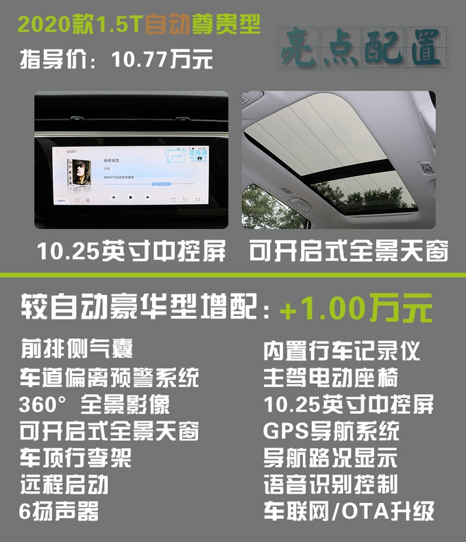 次顶配车型,在价格方面比自动精英型贵了一万元,升级的配置主要是安全和科技两个方面,升级的前排侧气囊、车道偏离预警、360°全景影像都属于比较实用的功能,确实能提高一定的行车安全性;科技方面,10.25英寸的中控显示屏、车联网、语音识别控制这些都属于当下的主流配置,笔者一直以来认为汽车除了机械结构要靠谱,还需要一些点到为止的科技点缀,两者结合才能最大程度增加驾驶愉悦性,这台自动尊贵型值得推荐给您。