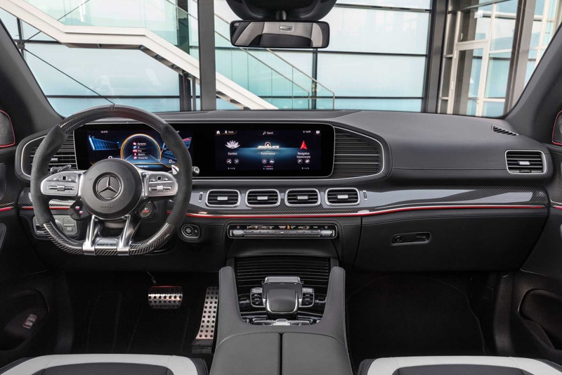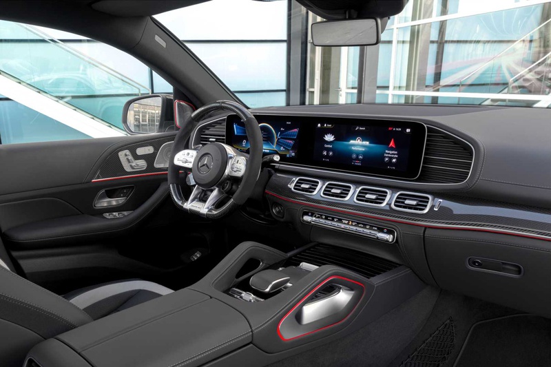 内饰延续GLE设计,同时也是奔驰家族化设计语言,细节上加入了碳纤维装饰板与红色装饰条,同时还换装了AMG专属方向盘。此外,新车还加入了车身稳定控制开关,MBUX信息娱乐系统中也加入了G值、秒表、马力/扭矩输出、发动机油温监测等信息,以便更好的观察车辆状态。
