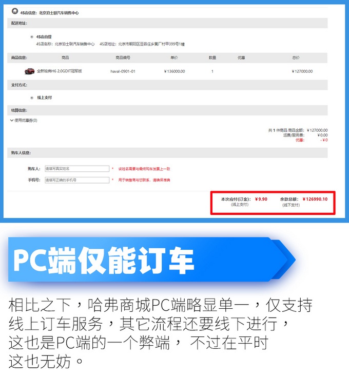各位若是有购置哈弗车型的打算,笔者建议下载“哈弗智家”App为最佳选择,体验效果也要优于PC端和手机端,但三者的共性在于线上均无法实现完整的购车流程。但现阶段,哈弗经销商可提供上门试驾、送车上门等线下服务,具体可详询当地经销商,如此一来可进行两者的优势互补。