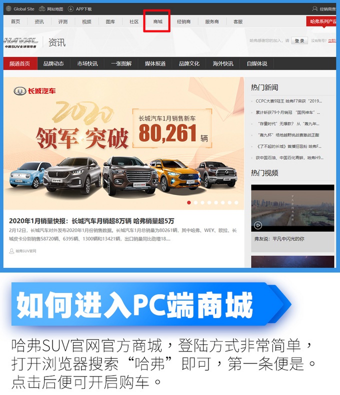 首先是PC端哈弗SUV官网官方商城,登陆方式非常简单,不需要记住任何域名,打开浏览器搜索“哈弗”即可,第一条便是。进入之后,可以看到其网站内容相当之全面,包含厂家的最新动向新闻、车型图片视频、经销商、媒体评测等等,你能想到的它都可给予。说实话,整体布局还有几分主流汽车媒体网站的意思,但这都不重要,好用即可。