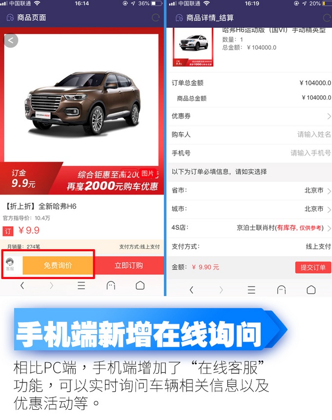 至此,已对三种线上购车方式进行了全面的了解,优势在于渠道较多,可以满足不同端消费者的需求,但笔者还是强烈推荐下载App进行体验。而这三种方式也有明显的弊端,无法提供完整购车流程,必要时还需去4S店试驾或提车,但各位也无需过于担心,前面也说到了哈弗经销商推出了专属购车政策、上门试驾、送车上门等线下服务。