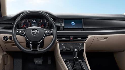 内饰虽为大众全新布局设计,但还是依然很容易让人猜到这是一台大众。横向贯通式中控台,视觉上更平顺。三辐平底多功能运动方向盘。大众传统机械仪表盘。中控中央为8英寸彩色触控屏,并支持CarLife和CarPlay。手套箱上边为亮黑拉丝渐变饰板。