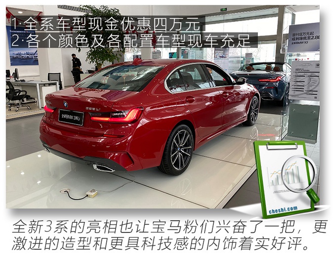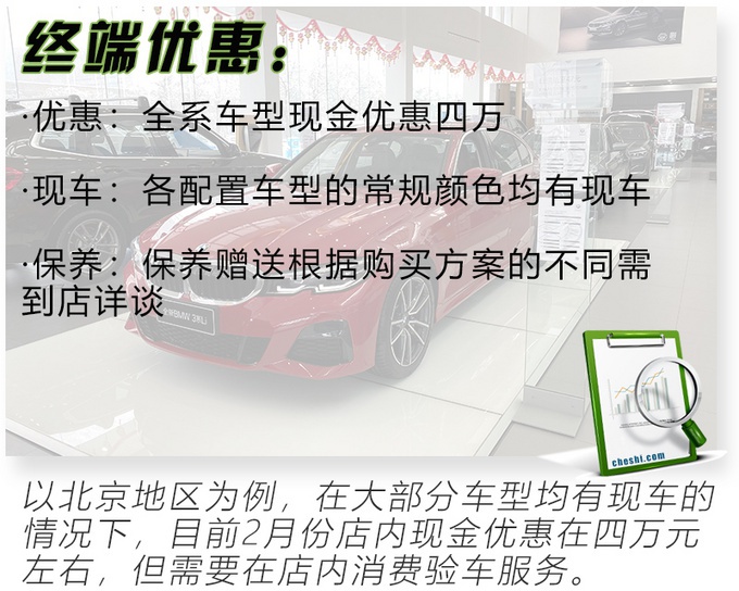 我们以宝马3系的2020款 325i M运动套装举例,官方指导价为31.39万元,现在店内现金优惠四万元,但需要在店内办理上牌验车服务费用约为4000元,各配置车型的常卖颜色(蓝色、红色、白色)基本均有现车,特殊颜色及需要选装的车型可能需要订车。