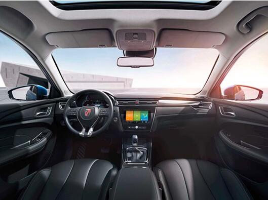 荣威i5为豪华全黑皮质环绕内饰。前门带有上下两层储物格。三辐多功能方向盘,并带有手动上下两向调节功能。高配车型带有12.3英寸液晶数字交互组合仪表。中低配则为3.5英寸TFT彩色交互行车屏。在中控中央上端为两个传统的空调出风口,右侧有一条银色饰板,连接到最右侧的不规则造型空调出风口。中控台正中央为10.1英寸高清触控屏,中配车型则为8英寸触控屏。