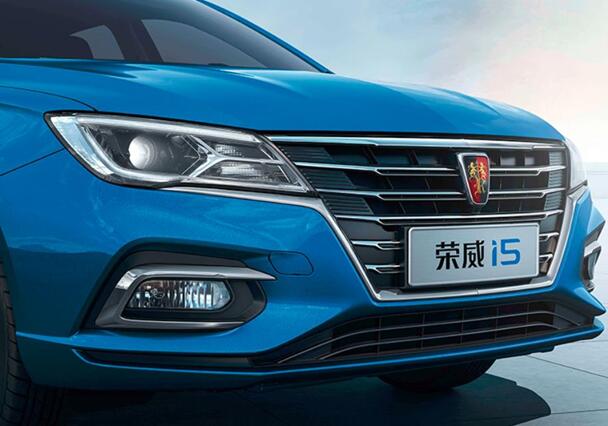 荣威i5前脸中央为五条镀铬横格栅,并被倒梯形包围。两侧上部被“C”字造型的LED灯围绕,中间呈现箭翎造型。两侧底部同样为“C”字造型的镀铬条包围着雾灯。整体造型延续荣威传统的霸气风格。