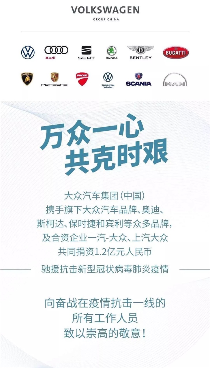 面对疫情肆虐,大众汽车集团聚全体系之力多措并举、齐齐发力,不仅通过捐资援助、发声呼吁等方式为抗击疫情提供了切实的支持,也在非常时期给用户与经销商带来了贴心服务与暖心关怀。