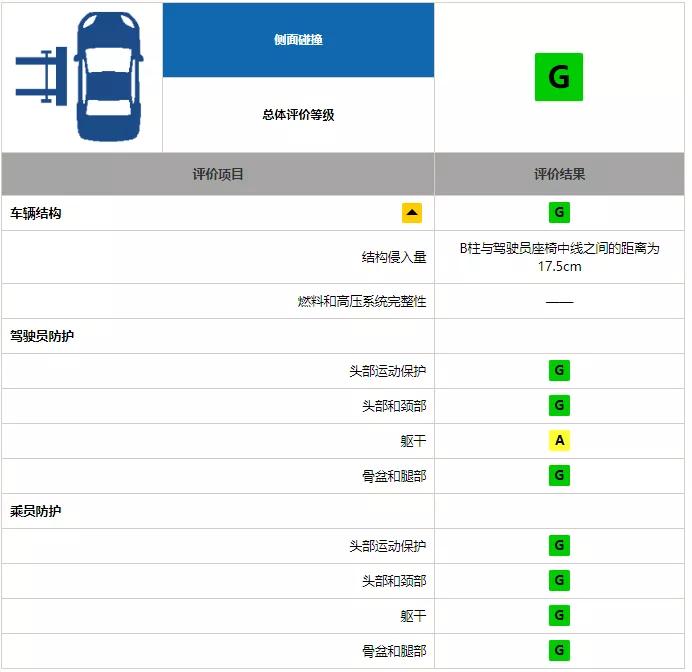 在时速50Km/h的侧面碰撞中,CS75 PLUS除了驾驶员防护中的“躯干”一项拿到A评级之外,其余所有项目都拿到了G评级。