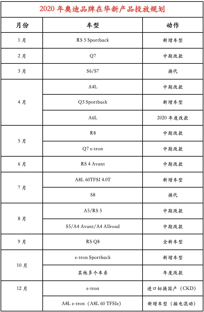 30余年,奥迪在国内豪车市场的的表现有目共睹,除了强大的产品力,其产品阵容也在不断完善,从轿车到SUV车型再到跑车,极大的满足了不同消费者的购车需求。从目前奥迪品牌发布的2020年在华新产品投放规划来看,其今年将在中国市场投放超过18款全新/换代/中期改款/衍生车型,在完善了自己产品布局的同时,进一步提升在豪华车市场竞争力,有望夺回豪华品牌销量第一的宝座。