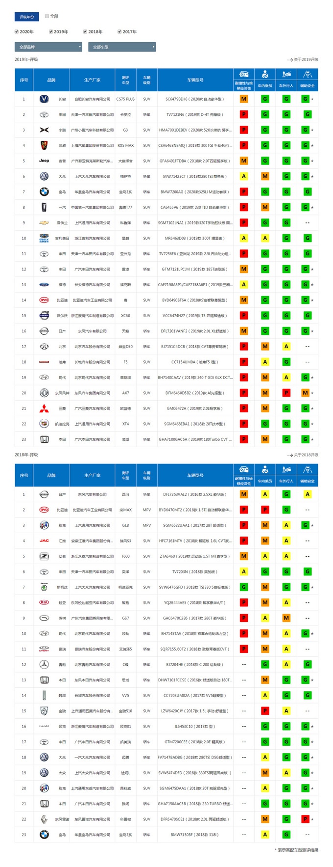 C-IASI指数2018年和2019年测试过的所有车型(图片来源C-IASI官网)