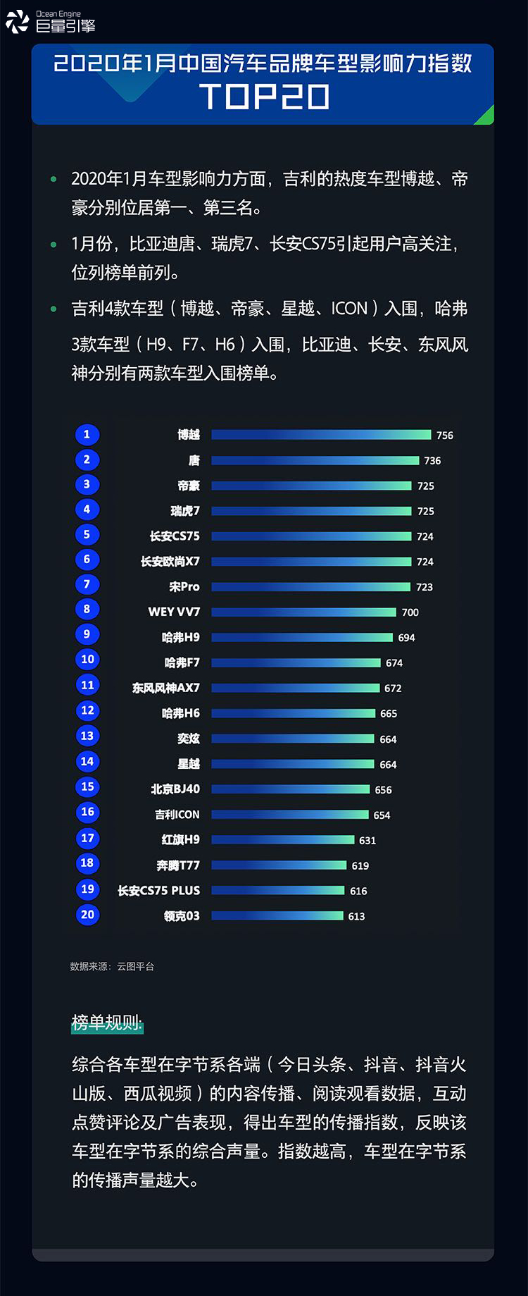 从报告发布开始,吉利便从未缺席过该榜单。今年1月,在吉利ICON (配置|询价)、帝豪 (配置|询价)、嘉际等多车型的高热度,以及疫情期间吉利捐款、驰援一线等内容的共同作用下,使得吉利在1月的影响力指数位列第一。