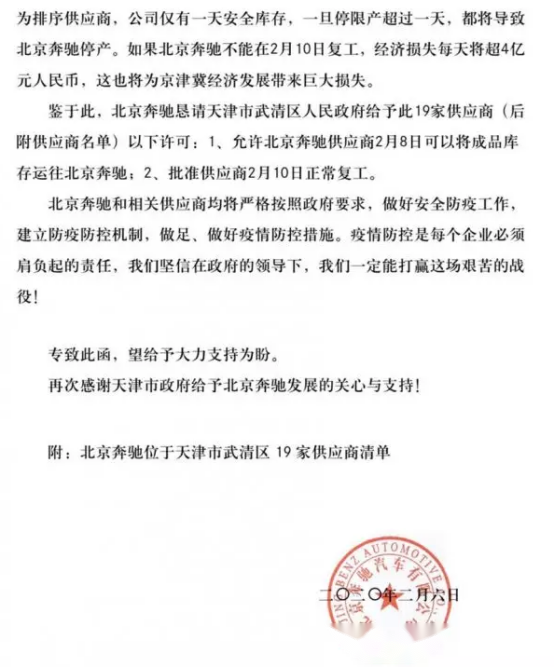 2月6日,北京奔驰向天津市政府以及天津武清区发函,请求特批其在当地的19家零部件供应商提前复工。函中称,北京奔驰仅保留有一天的安全库存,陷入复工即停产的尴尬境地。若相关供应商不能提前送抵零部件库存成品,北京奔驰难以在2月10日正常复工,其单日损失将高达4亿元。