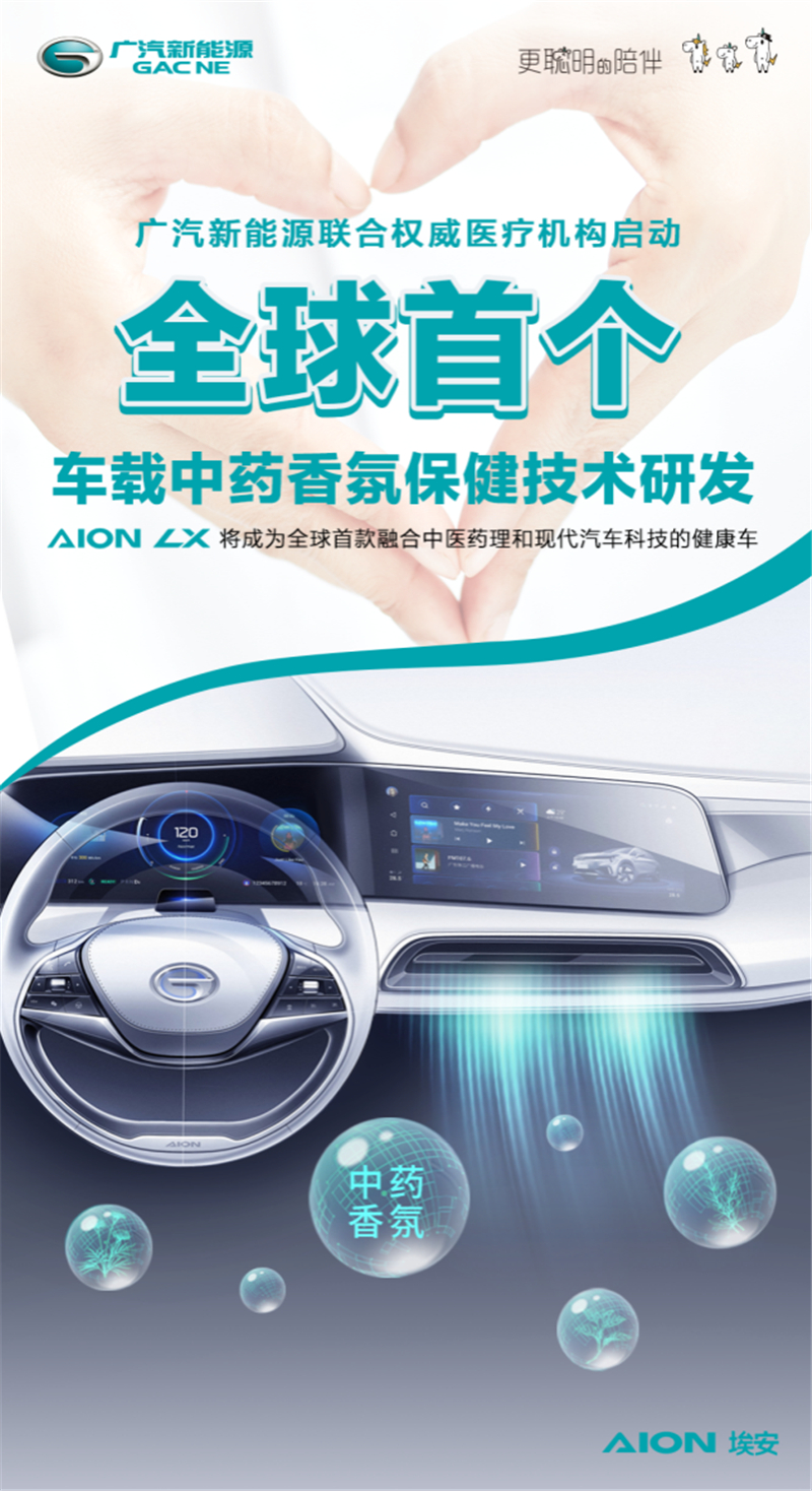 近日,广汽新能源联合权威医疗机构,正式启动研发车载中药香氛保健技术,并将率先装备豪华智能超跑SUV Aion LX (配置|询价),打造全球首款融合中医药理的健康车。