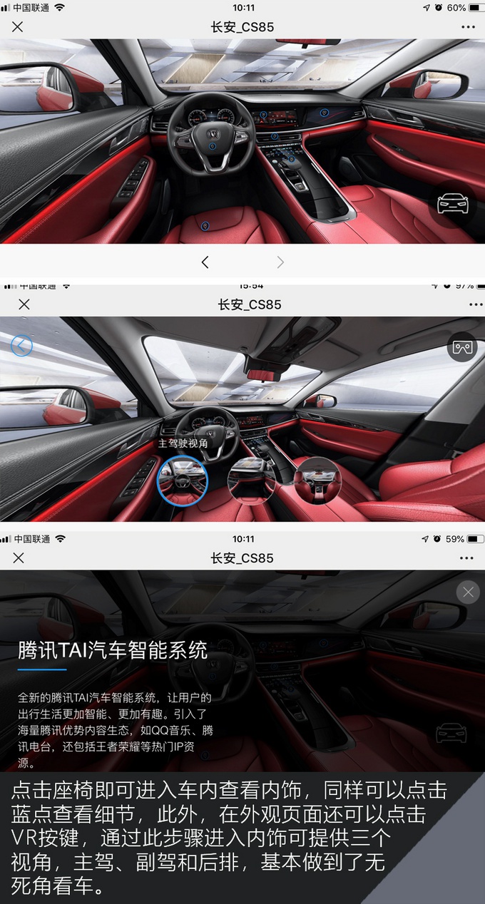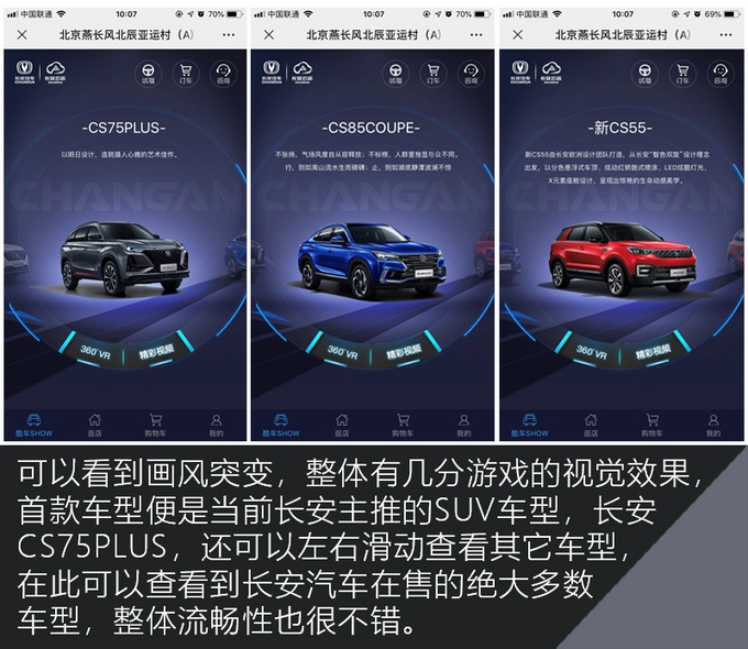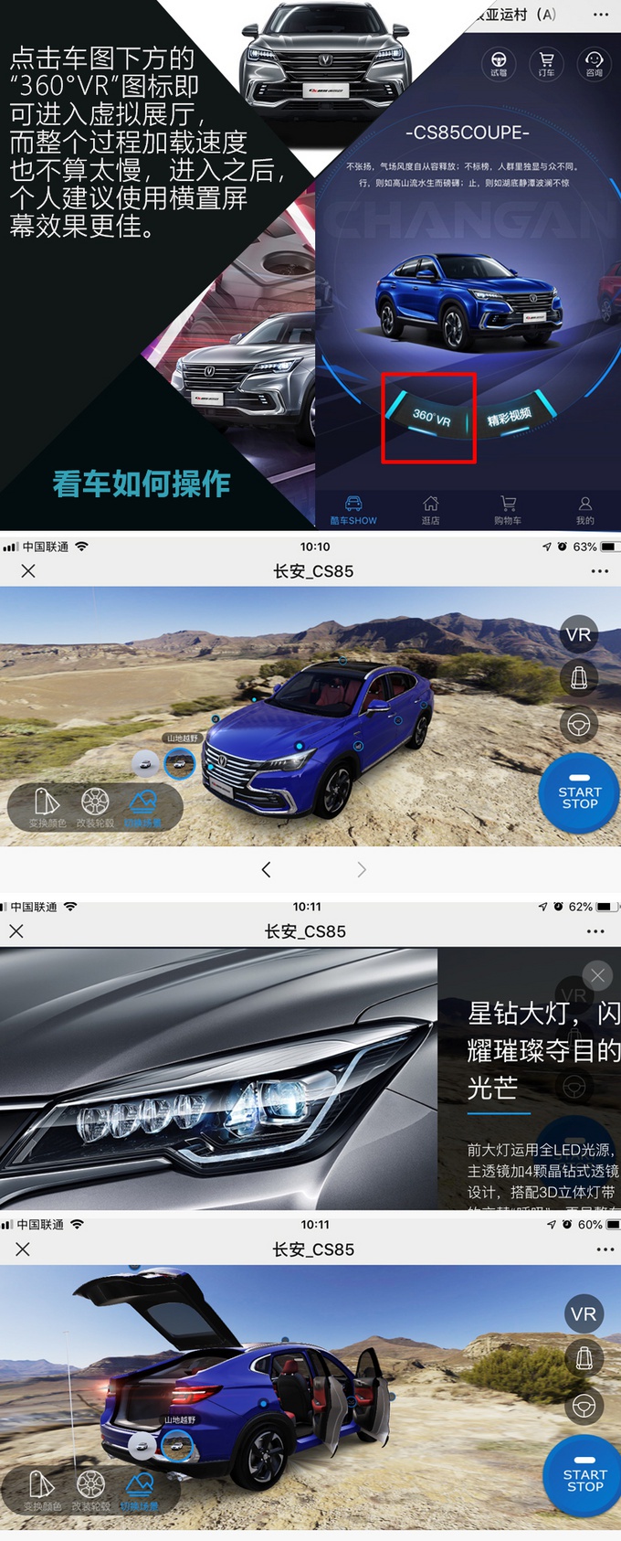 我们以家族轿跑SUV车型CS85 COUPE为例,进行体验,点击车图下方的“360°VR”图标即可进入虚拟展厅,而整个过程加载速度也不算太慢,进入之后,个人建议使用横置屏幕效果更佳。与绝大多数品牌不同的是,在长安的模拟展厅内可以任意摆布车辆进行查看。