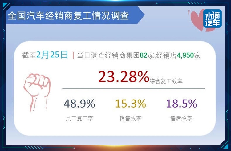 上游供应商恢复能力还未可知,下游经销商情况同样不容乐观。根据中国流通协会公布的中国经销商节后复工数据显示,截至2月25日,所调研的4950家经销商的综合复功率仅为23.28%。其中,员工复工率为48.9%,也就是说只有一半的经销商开店;销售效率仅为15.3%,这意味着整车销量情况更是惨淡,消费者的购买意愿非常低。