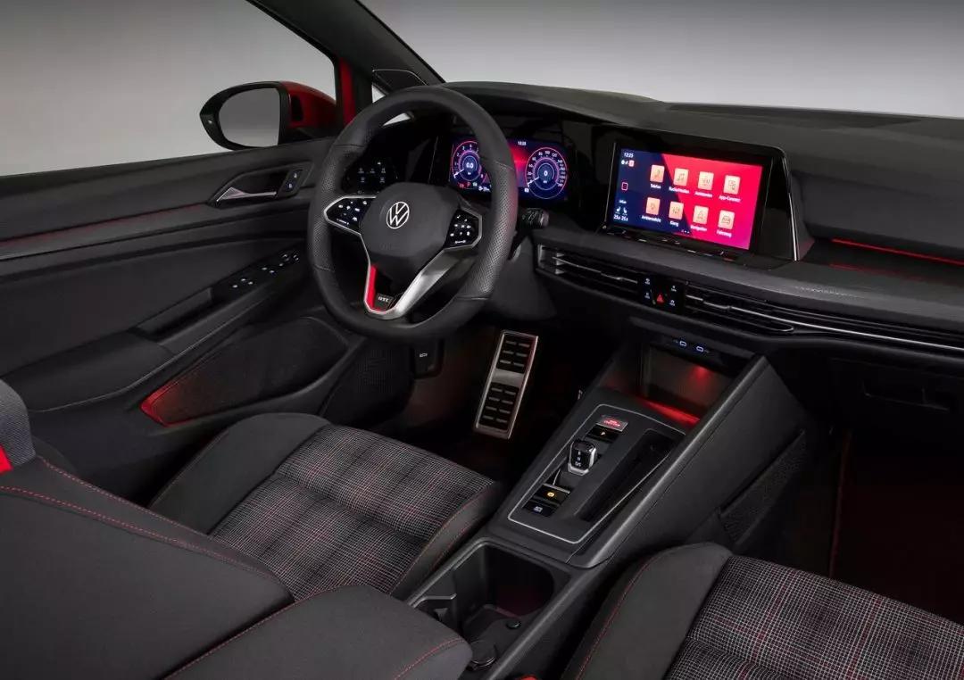 内饰当然少不了你们最爱的格子布座椅,椅背上有红色点缀,整个造型看起来是充分考虑了支撑性的。除了传统元素,全新GTI的内饰自然得跟上时代,所以咱们能见到10.25英寸全液晶仪表及连成一体的8.25英寸中控屏、简约的贯穿式出风口、保时捷911 (配置|询价)同款“剃须刀”挡把。