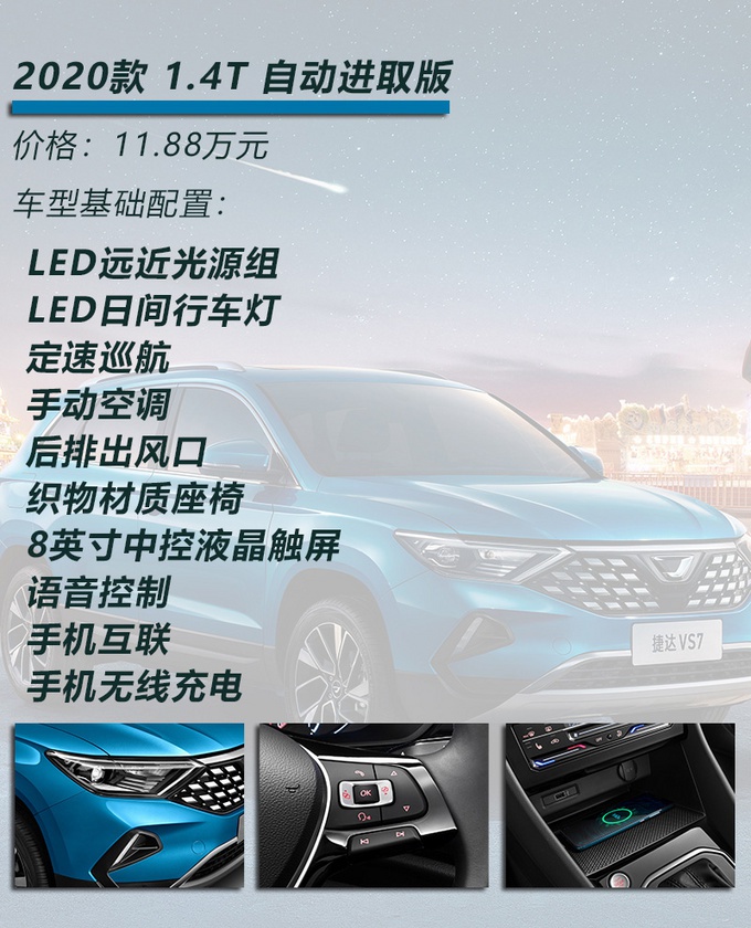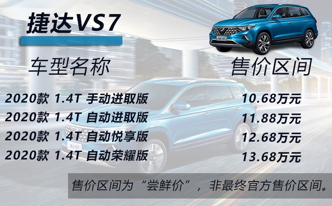 秉承着德系技术和大众品质,让捷达品牌旗下的产品俘获众多消费者的心。而就在前不久,作为捷达品牌的第三款车型、定位于中型SUV的捷达VS7 (配置|询价)正式对外公布了“尝鲜价”,全系共推出4款车型,价格区间为10.68-13.68万元。