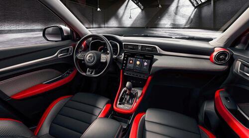名爵内饰更显运动气息。整体为黑色氛围,并有碳纤维风格饰板和红色点缀。中控两侧为炮筒式的空调出风口。同样为三辐式多功能平底方向盘。顶配独有的7英寸智能显示液晶仪表盘,其他配置为3.5英寸。10.1英寸悬浮式多媒体触控大屏。机械式换挡杆,周围还有碳纤维风格饰板装饰。