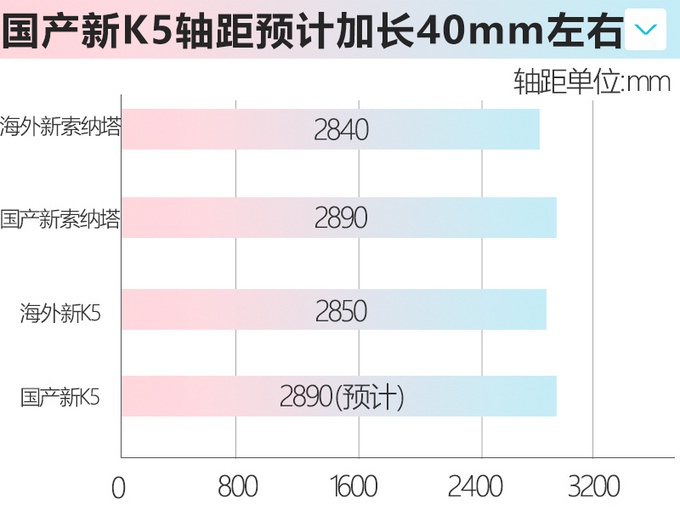 据东风悦达起亚内部透露,本次K5的加长以及推出更强动力车型,可以更符合中国消费者的需求。目前国产版全新K5的尺寸尚未曝光,不过参考同为现代汽车集团的“兄弟”车型第十代索纳塔,该车国产后车长和轴距分别增加55mm、50mm,达到4955mm、2890mm可以说是同级别中尺寸较大的车型。而海外版K5换代后本就已经加长,轴距为2850mm,预计国产后也会加长40mm左右。