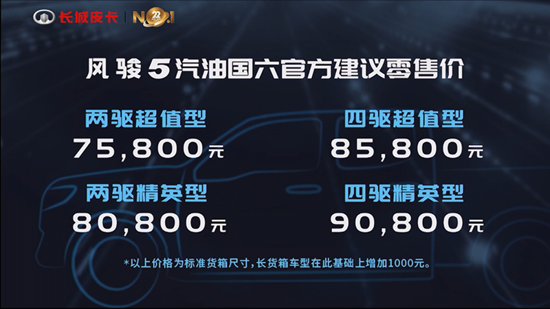 2月29日,长城皮卡风骏5 (配置|询价)汽油国Ⅵ版车型正式上市,新车共推4款车型,售价区间7.58万-9.08万元(长货厢版车型相应增加1000元)。与此同时,官方还推出了3000元抵6000元、1年0息及3000元的置换补贴等礼遇。