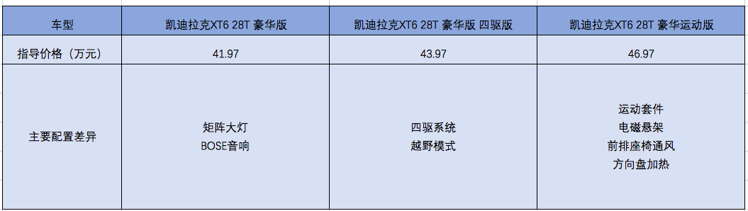 相比之下,凯迪拉克XT6的指导价41.97——54.97万,无疑极具性价比。事实上,即便是最低配的28T六座豪华版,含金量依旧不低。包括全LED矩阵大灯、BOSE音响、后排独立空调,以及一系列的主被动安全配置。