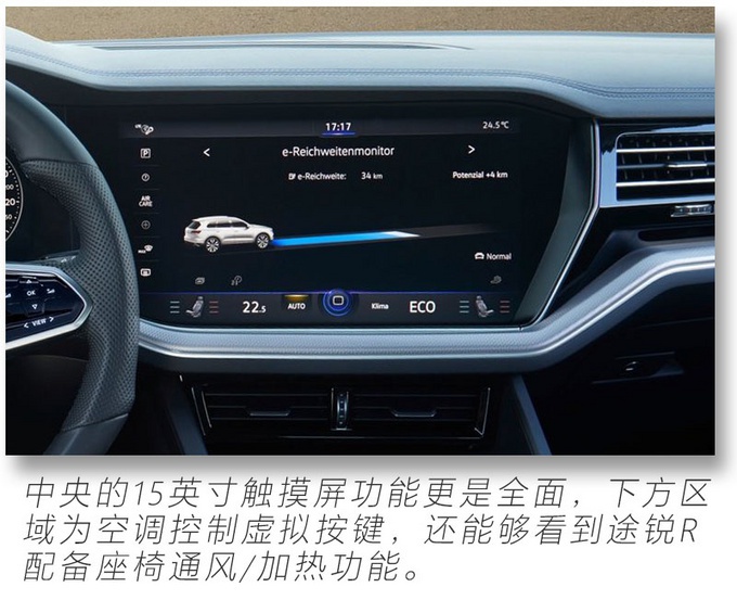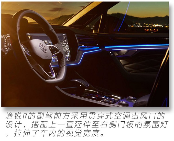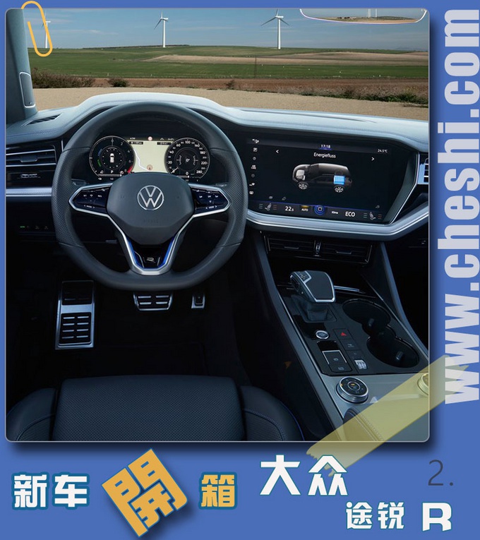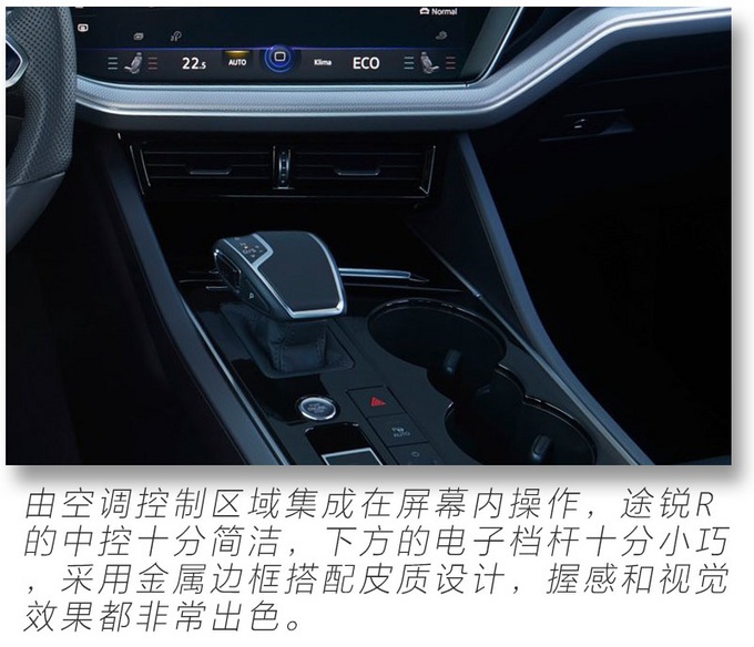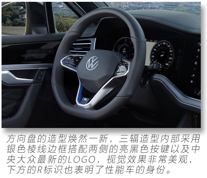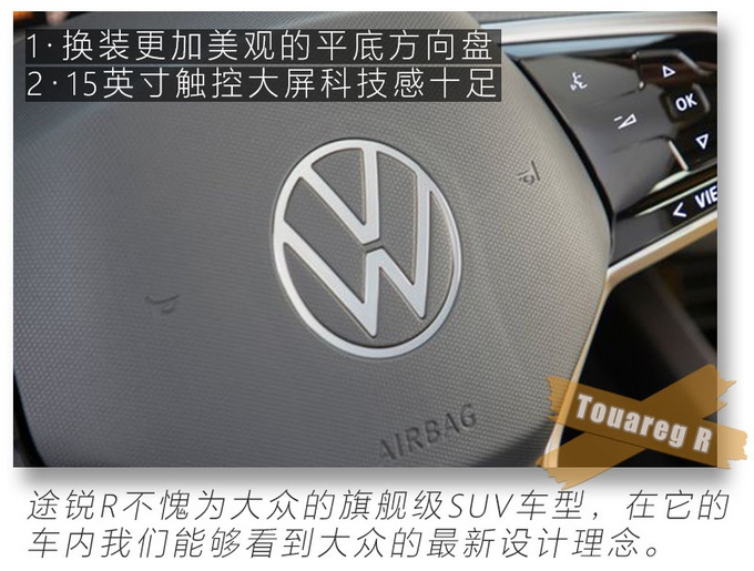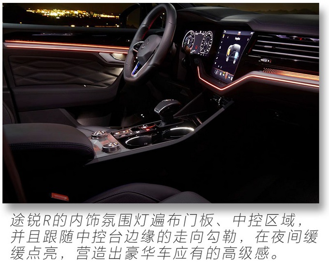 12英寸全液晶仪表搭配中控15英寸触控屏幕带来在以往大众车型上少见的科技感,还能看到R系列独有的性能元素,遍布内饰的氛围灯则展现途锐R豪华、精致的一面,相信大家和我一样对途锐R的性能较为关注,作为大众R系列首款插电混动车型,也是大众R系列首款中大型SUV,它究竟有多强悍?别急!请继续关注我们的后续解读文章。
