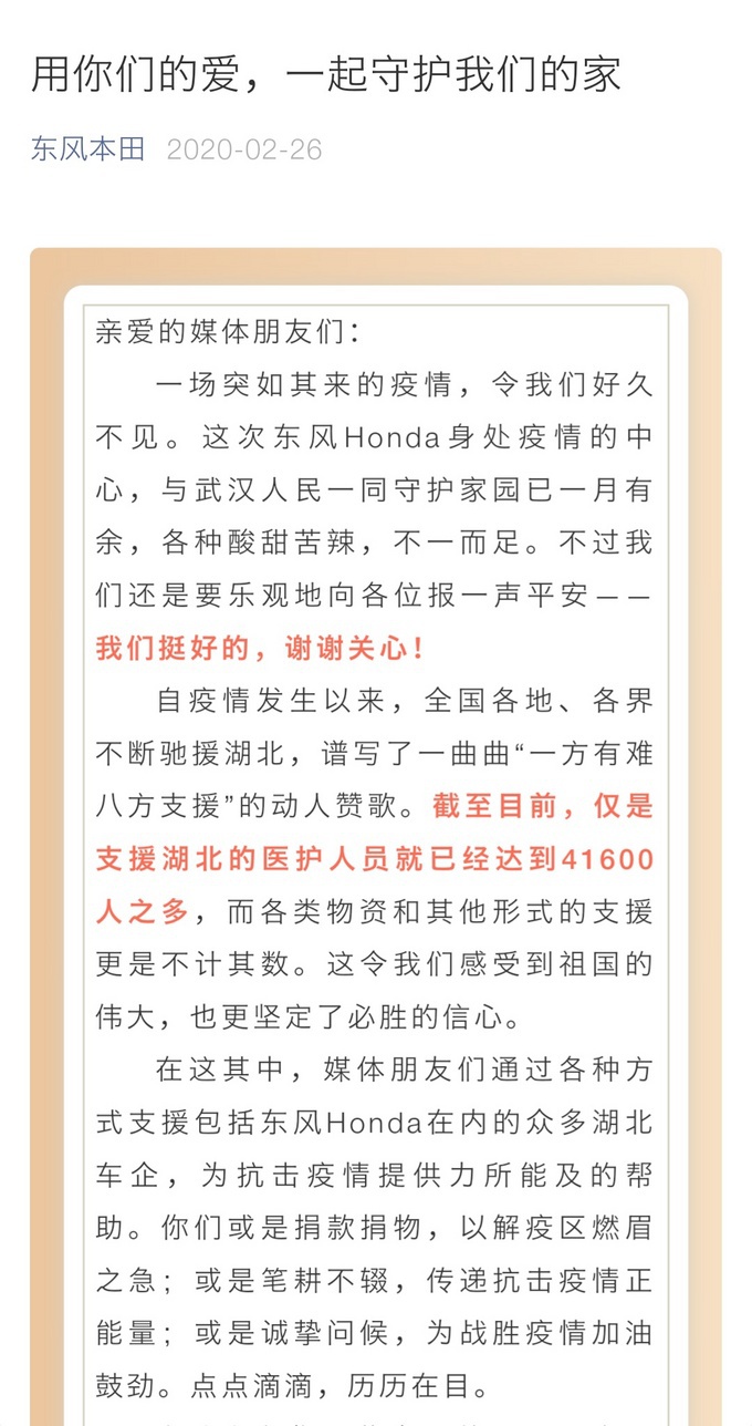 2月26日,东风本田的官方微信公众号推送了一篇题为《用你们的爱,一起守护我们的家》的感谢信。文章用一种近乎备忘录的方式,详尽地记录了许多来自社会各界的帮助与关怀,并对这些帮助和关怀诚恳地表达了谢意。