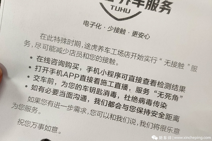 接完车、把车开去工位后,接待员就给我拿来这么一张纸,这上面也算是途虎在面对现在这种特殊情况的一种应对吧。