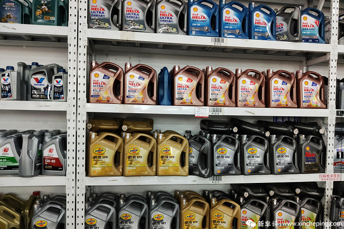 我的车保养这个工位正对着一面“机油墙”,还挺壮观的。看了一下,这里存货最多的是壳牌和壳牌旗下的鹏致机油,估计这是平时用量最大的品牌。另外,我之前在APP上下单时,壳牌在途虎的价格也明显比同档次的美孚和嘉实多便宜,估计这也是销量大的原因之一吧。